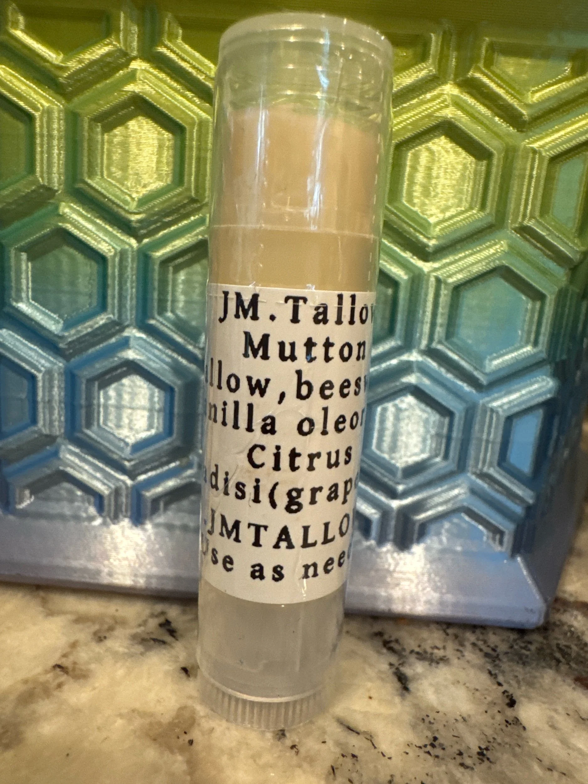 Mutton tallow with locally sourced beeswax vanilla Oleoresin and grapefruit peel essential oil.